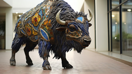 A sculpture of a bison in front of an office building, AI