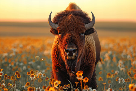 Bison in a field of yellow flowers at sunset. Wild animal