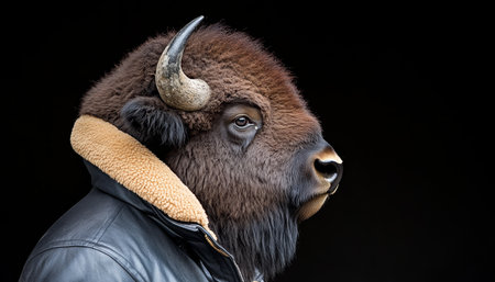 Stoic Bison in Profile Wearing Human Suit, Embracing Anthropomorphism, Against Dark Background