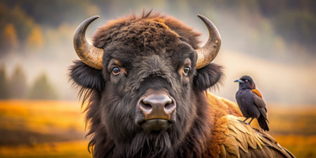 Bison with crow on the background of autumn forest and fog.