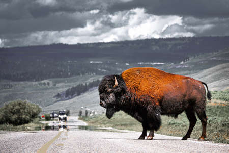 A curious bison looking at visitors and standing still for a portrait at Yellowstone National Park, Wyoming.