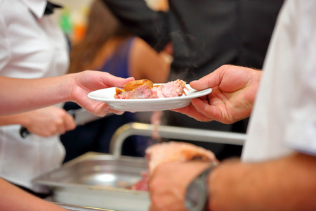 waiter serves roasted meat and baked potatoes at the party or wedding reception