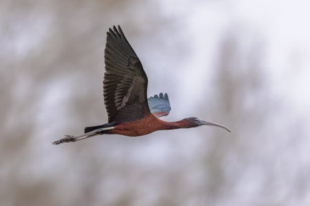 Glossy ibis (Plegadis falcinellus) flying in habitat of Ebro delta nature reserve, Catalonia, Spain.