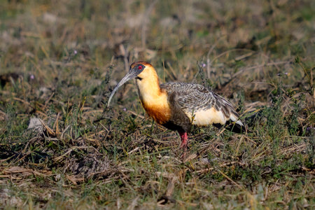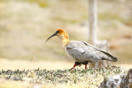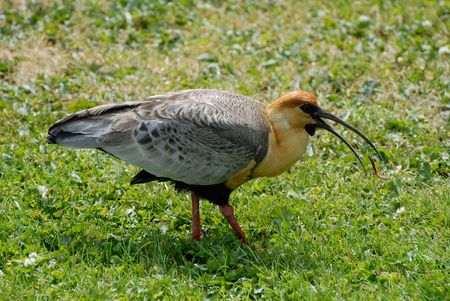 Black-faced ibis, Theristicus melanopis, walking in grass looking for food. Bird found in grassland and fields in southern and western South America.