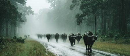 Captures Buffalos walking on a wet road in a lush, foggy rainforest under heavy rain. Trees surrounds the path with a moody and cinematic style.