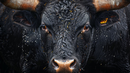 close-up portrait of a bulls face, with its dark, wet coat and intense gaze. The light catches its eyes, highlighting their golden flecks.