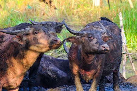 Herd of Thai buffalo cooling during the day