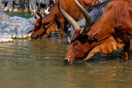Long horned african cattle drinking water from the river, Afar region, Ethiopia