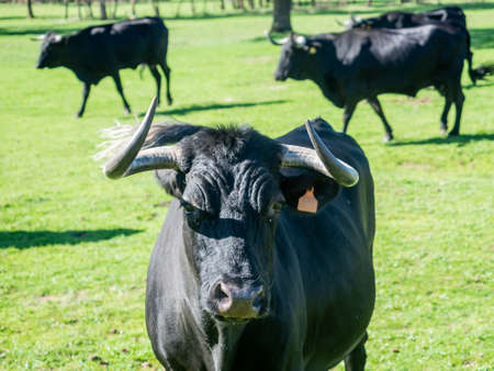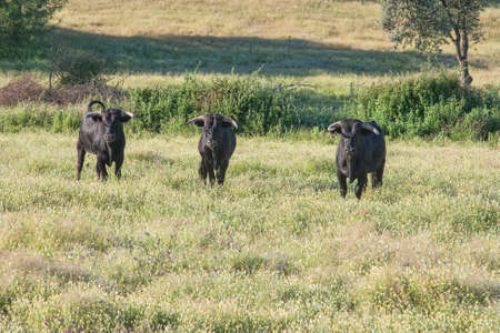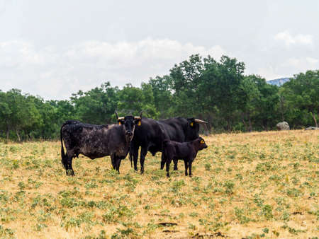 Three brave bull looks at us defiantly in the middle of the Extremadura pasture. Outdoors.