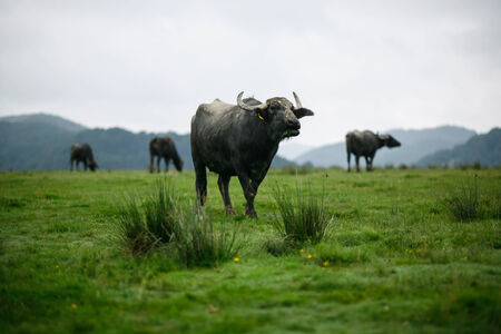 Asian water buffalo on the grassland with outdoor sunset lighting.