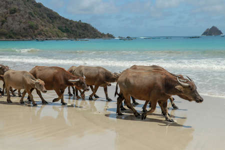 Water buffalo walking on white sandy beach at Lombok Island. Herd of buffaloes strolling by the pleasant evening beach.