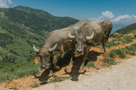 three water oxes buffalos near Hai Van Pass in Vietnam