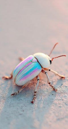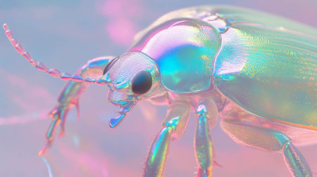 An iridescent beetle displays a vibrant array of colors across its shell, set against a soft, out-of-focus backdrop. The close-up shot highlights the insect's detailed legs and antennae. Suitable for scientific illustrations, nature articles, or designs related to biodiversity, this image captures the beauty of nature.