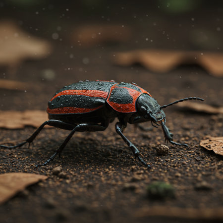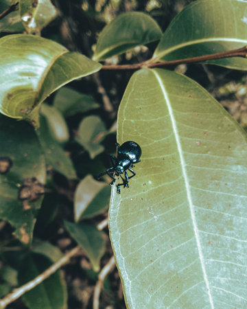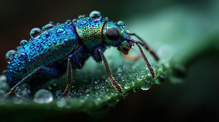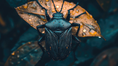 A striking close-up of a dark beetle resting on a leaf adorned with water droplets. This macro photography captures intricate details of nature and wildlife.