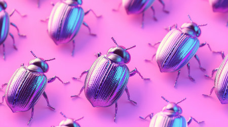 A captivating collection of colorful beetles positioned against a vibrant pink background, showcasing intricate details and a unique metallic finish. Perfect for creative projects.