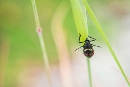 black stinkbug larvae on green leaf in the wild natural state.