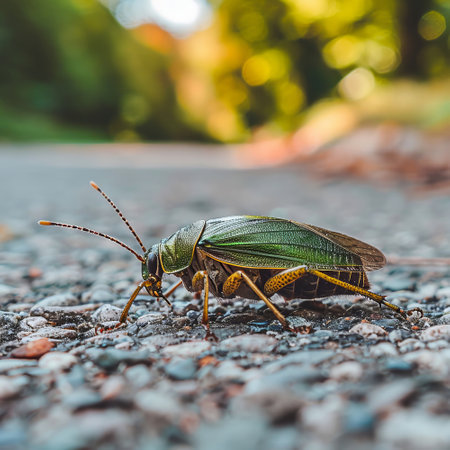 A cockroach is seen crawling along a gravel path on a sunny afternoon, surrounded by lush greenery and blurred trees in the background, showing the beauty of nature in a peaceful setting..