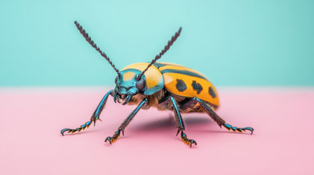 A vibrant beetle with yellow and blue colors is walking on a soft pastel surface, showcasing its distinct spots and striking features.