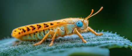 A vibrant orange insect with striking blue eyes sits atop a green leaf, showcasing its unique patterns and textures in a lush environment filled with greenery.