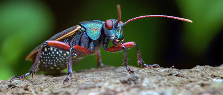 A stunning macro shot of a colorful beetle resting on a mossy log, showcasing intricate details and vibrant colors that highlight nature's beauty.