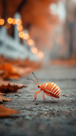 A vibrant orange and white insect moves along a path covered with fallen leaves. Soft lights twinkle in the blurred background.