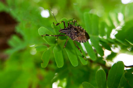 Stink bug on green leaves, North China