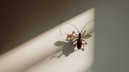 A brown insect crawls on a light surface creating a distinct shadow in the midday light