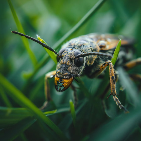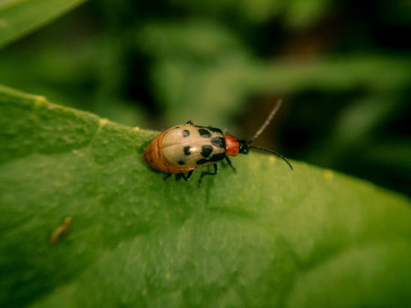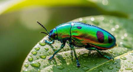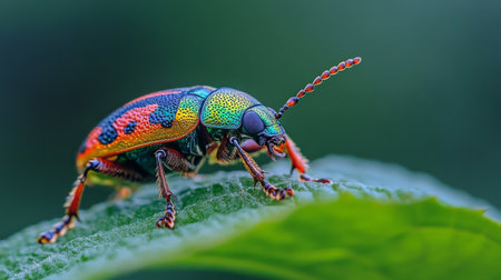 A vibrant beetle perched gracefully on a lush green leaf, showcasing intricate patterns and colors. This close-up captures the essence of nature's beauty and diversity.