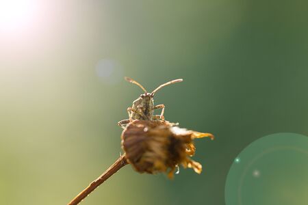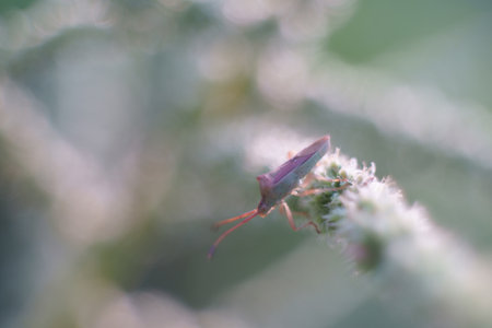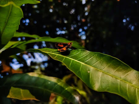 The small bug perched on green leaves in the garden.