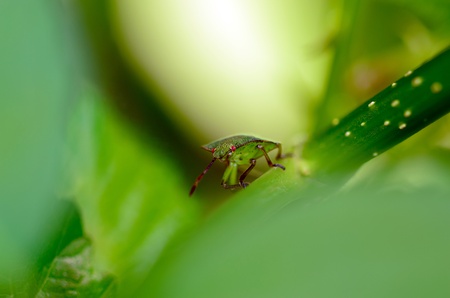 a stink bug on the green leaf.