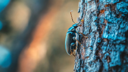 A detailed view of a beetle crawling on a tree bark, highlighting its shiny shell and the rough texture of the wood in the background