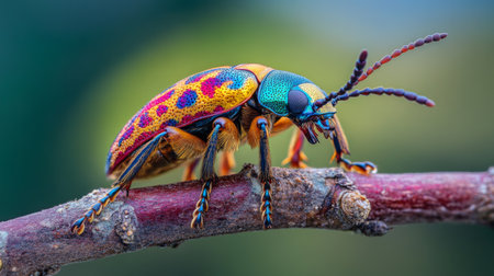 High-resolution close-up of a colorful beetle on a branch, highlighting its vivid patterns and glossy exoskeleton against a contrasting background.