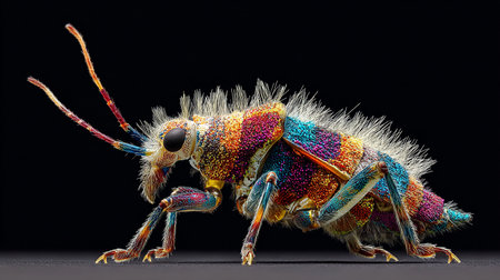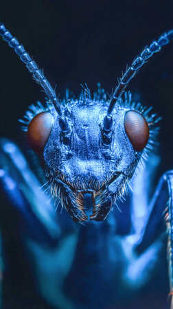 Explore the stunning detail in this close up of an ant showcasing its unique features and vibrant colors under a captivating light.