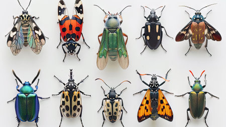 Explore the intricate world of insects with a captivating set of nine diverse specimens, meticulously displayed against a pristine white background.