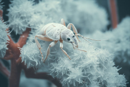 In a serene, dreamlike world of soft textures and pale lavender hues, a tiny weevil embarks on a gentle journey across a delicate feather. This macro perspective captures a moment of quiet discovery and the fragile beauty found in the smallest corners of nature, evoking a sense of peace and wonder.