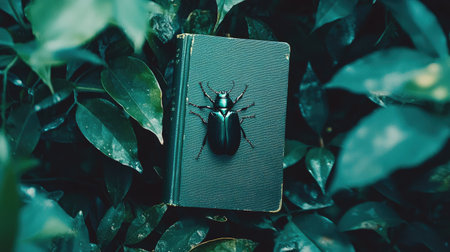A striking black beetle rests atop a vintage book, surrounded by vibrant green leaves. This image evokes a sense of nature's beauty and mystery.