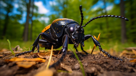 Macro shot of a black and red beetle on the ground in the forest