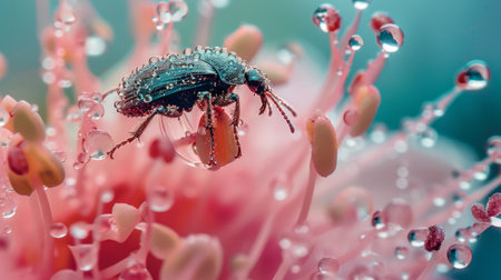 A stunning macro shot of a colorful beetle on a mossy surface adorned with water droplets. This close-up reveals intricate details and vibrant hues of nature