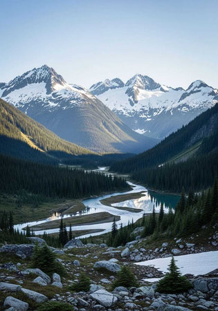 A serene mountain landscape with a winding river and snow-capped peaks under a clear blue sky