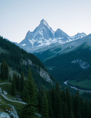 Mountain landscape with snow-capped peaks and coniferous forest