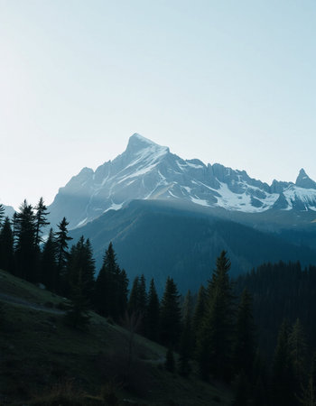 Mountain landscape with snowcapped peaks and coniferous forest