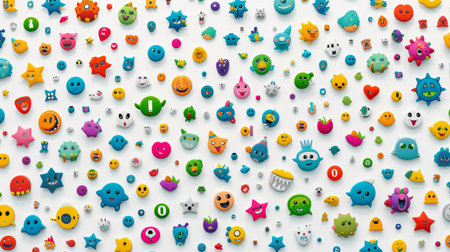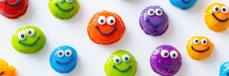 Colorful microbes with smiling faces and large eyes come together to form a lively arrangement against a white backdrop, bringing joy and energy.