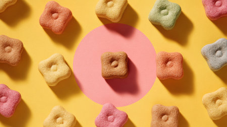 Central pet treat surrounded by multicolored snacks against a bold colored backdrop, ideal for attracting attention in a digital advertisement.