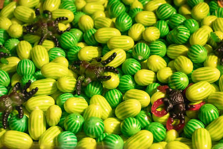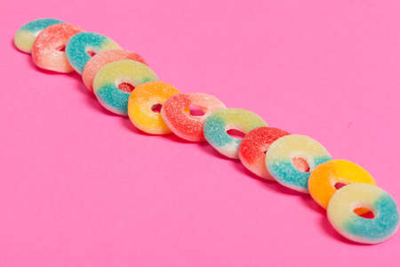 Candies with jelly and sugar. colorful array of different childs sweets and treats. Bright party background.