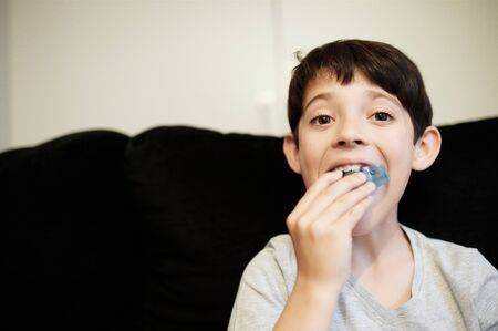 boy shows myofunctional trainer. Helps equalize the growing teeth and correct bite, develop mouth breathing habit. Corrects the position of the tongue.