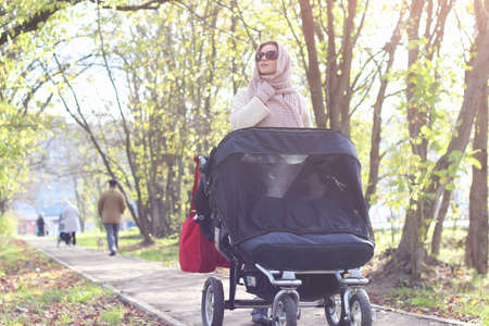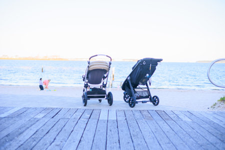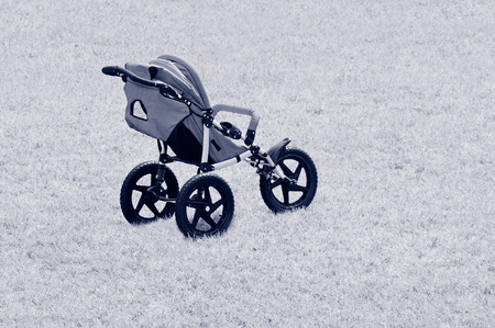 A modern pram isolated against a green grass background during summer season. Concept photo of baby, babies, children, family and pregnancy lifestyle.