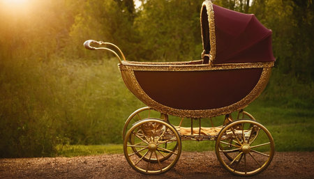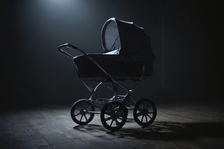 A relic of a bygone era, an old-fashioned baby stroller, manifests a poignant memory in this black and white image. The isolation, accentuated by the gallery-style single light source, elicits an intense and somewhat melancholic ambiance of yesteryears.