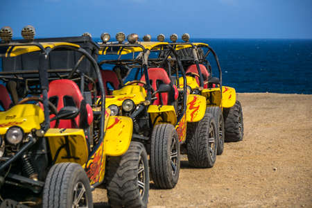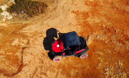 Aerial view of buggy car on the sandy on the sea coast of Cyprus or Greek in summer. Extreme trip off road place. Lovely outdoor adventure for tourists