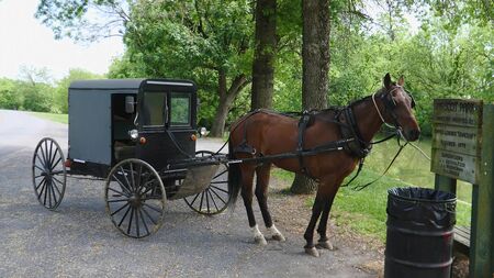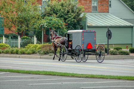 Outdoor view of Amish horse and carriage travels on a road in Lancaster County