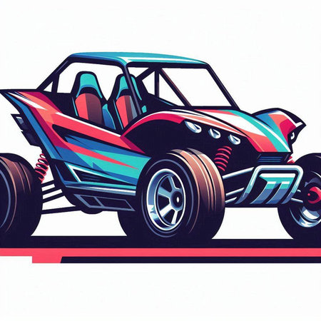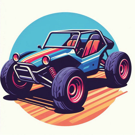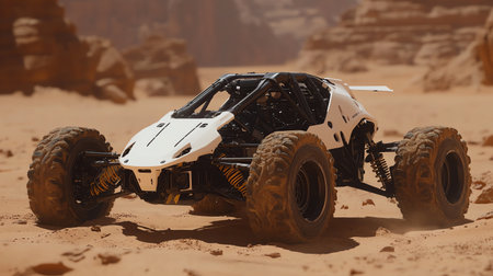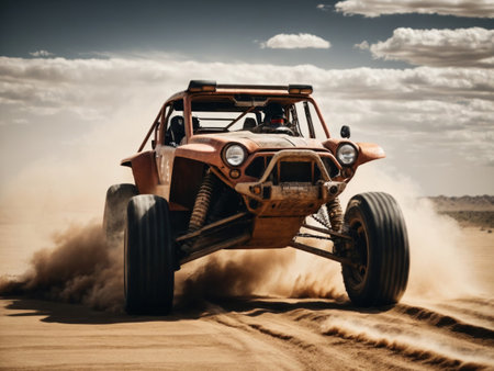 The off-road buggy races through a cloud of dust and sand, demonstrating power and dynamics in a thrilling adventure on the track.